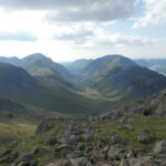 Up early to catch the sunrise (well everyone except me that is) we had breakfast and packed away to head for the next Wainwright Pike of Stickle. At Loft Crag Peter said his goodbyes and headed off. Trevor, Dean and I dropped down off Loft Crag and headed to Rossett Pike. It was already well into the mid twenties at only 10:00am, we stopped by a stream below Martcrag Moor to take on some water and to cool our hot feet. Arriving at Rossett Pike around lunchtime we headed over to Angle Tarn for some grub. The steady climb out of Angle Tarn towards Great End was made more taxing given the Mediterranean temperatures. The path got steadily more busy as we approached the tourist hot spot of the Eastern flanks of Scafell Pike. Dean having already bagged a fair few of these summits opted to watch the packs while Trevor and I nipped up Great End to bag it. Having ticked it off the list we regrouped and headed over to Scarfell Pike before following the very busy path towards Lingmell Gill and around to Wasdale Head for a well earned pint. The small campsite was crowded so after some food and a few beers we headed back out onto the access land north into Mosedale. The three of us pitched our tents as light was fading, not a sole in sight, a far better location than the crowded, noisy campsite back in Wasdale!